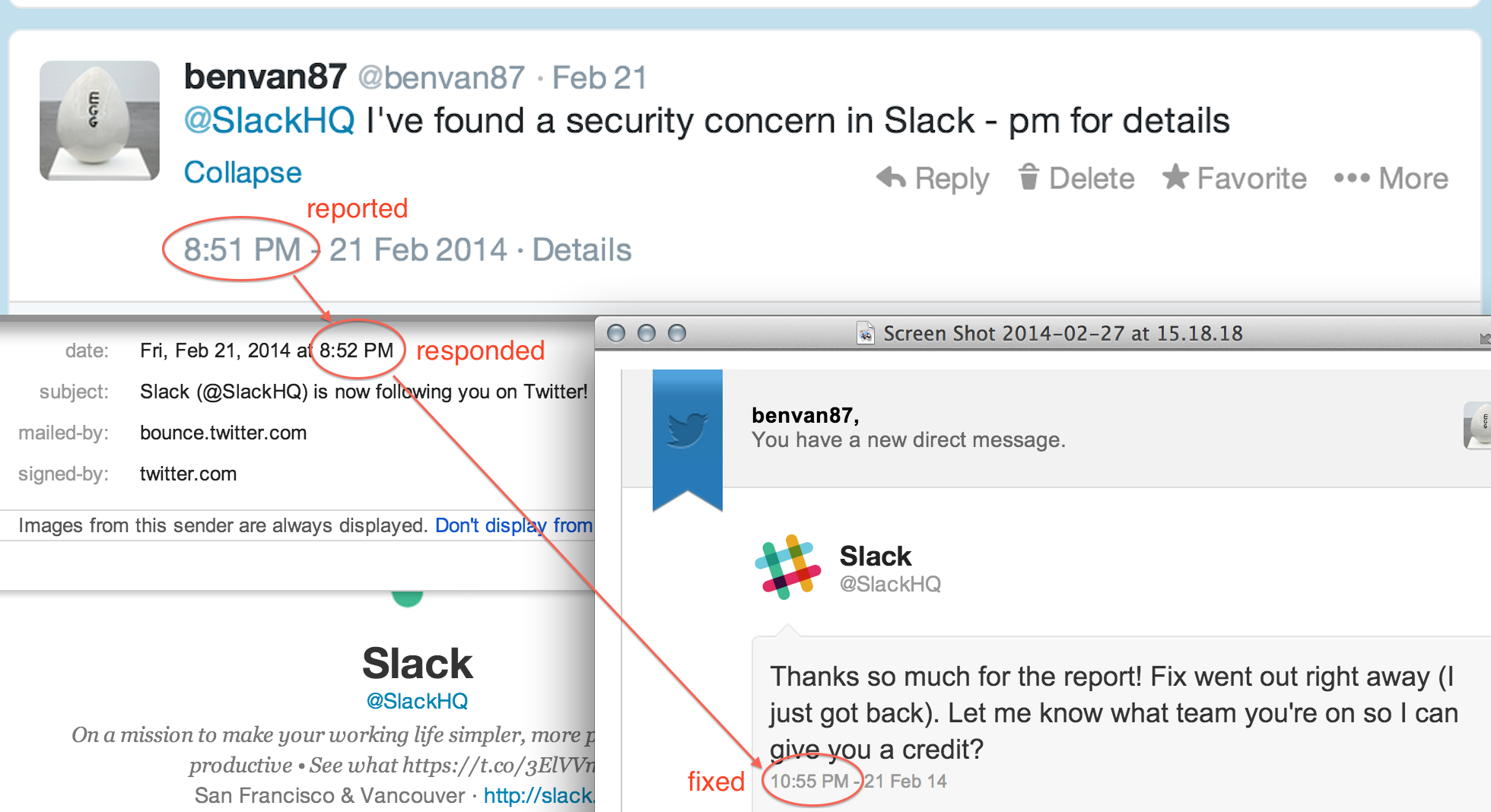 Slack took 94 minutes to roll out a fix (I sent them the actual report at 21:21)